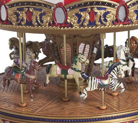 Mr. Christmas Animated Double Decker Musical Carousel - QVC The Mr. Christmas Animated Double Decker Musical Carousel is a fun, festive accent for your holiday home. Wonderfully scaled to fit most village collections, it showcases painted horses, tigers, lions, and zebras as the carousel festively spins. Plays 15 Christmas carols and 15 year-round classics. Made of plastic. Includes adapter.